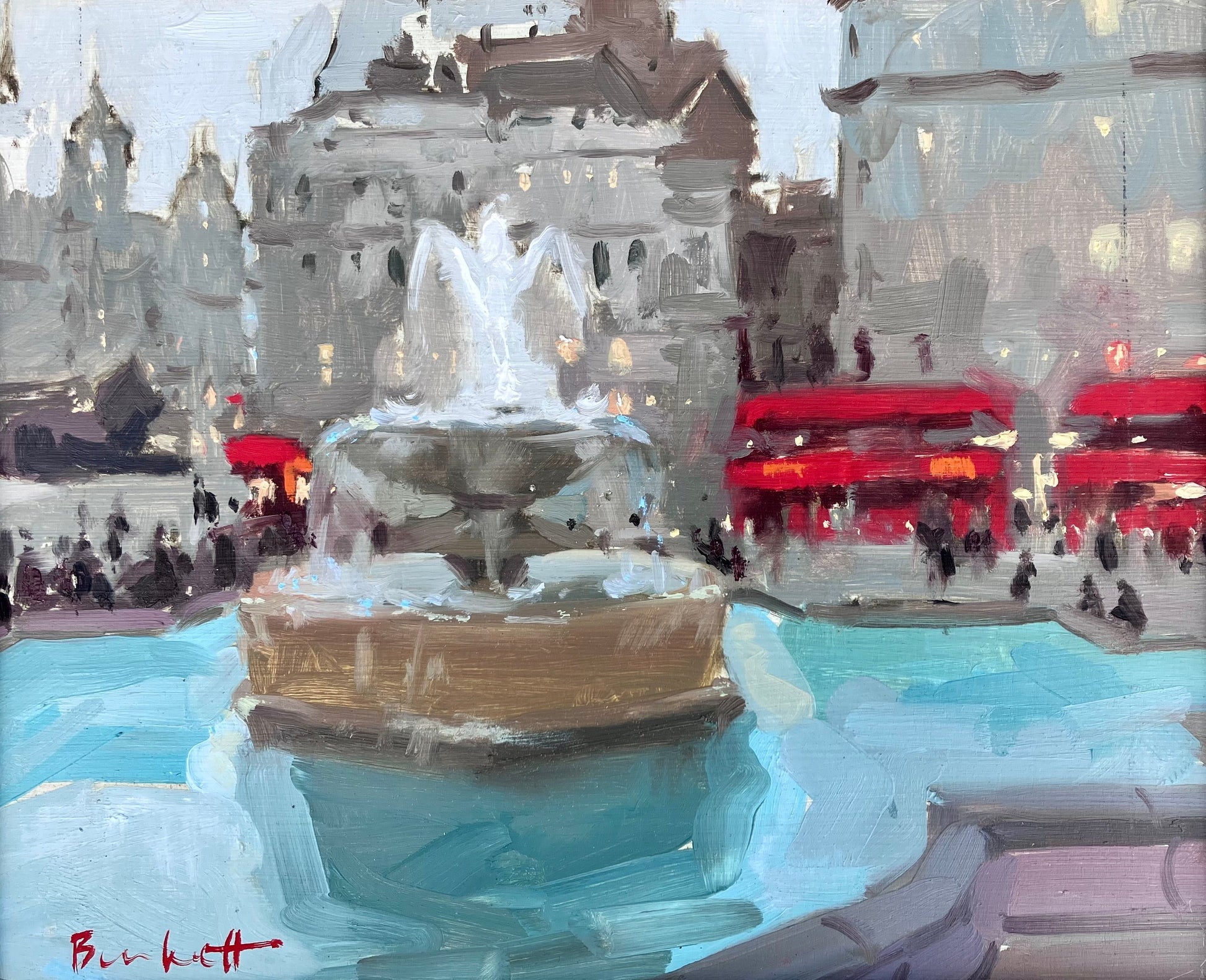 Experience the beauty of London with Trafalgar Water & Buses. Capture the essence of the bustling Trafalgar Square with an original oil painting, featuring iconic red buses and a tranquil water fountain, painted 'en plein air' by professional artist Stewart Beckett. A must-have for any art lover's collection!